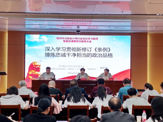 为深入开展党纪学习教育,进一步凝聚干事创业力量,6月28日,鄂州市注册会计师行业党委召开警示教育大会,市财政局党组成员、副局长、一级调研员,市注册会计师行业党委书记胡茨芬出席会议,并为全体党员讲授纪律党课。全市各会计师事务所党支部书记及负责人、全市行业党员、部分业务骨干等40余人参加会议。