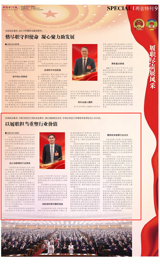 作为全国政协委员、中国注册会计师协会监事长、湖北省新联会会长、中审众环会计师事务所首席合伙人,石文先在注册会计师行业深耕30余载,始终将行业发展记挂于心。在行业发展遭遇舆论困境、信心降至冰点的关键时期,他以政协委员的责任与担当为笔,以深入调研的专业与务实为墨,提交提案为行业发声,用实际行动为注册会计师行业砥砺前行鼓与呼,彰显了新时代政协委员的履职风采。“全国政协委员是荣誉与光环,更是责任与担当。政协委员履职需要的是公心,考验的是‘眼心’,扎实落地需要的是耐心。”这是石文先始终秉持的履职理念。而“捧着一颗心来,不带半根草去”,则是他在政协委员履职之路上,对注册会计师行业赤诚之心的真实写照。2024年是注册会计师行业发展史上极不平凡的一年。国家对行业的严监管持续加码,企业财务造假事件的曝光让行业置身舆论漩涡,监管部门对涉事机构和人员的严厉处罚,在规范行业发展的同时,也被部分不良自媒体刻意渲染、推波助澜,“高危行业”的标签被强加于注册会计师行业之上。随之而来的是行业人才持续净流出,行业高质量发展受到严重影响。“行业未来在哪里?行业真的没有前途了吗?”成为横亘在每一位行业从业人员心中的沉重疑问。深知行业在国家经济社会发展中无可替代的巨大价值,石文先清晰地认识到,舆论口中的所谓“行业终点”,绝非行业真正的发展镜像,更多的是别有用心自媒体的刻意引导,以及不明真相人士的情绪宣泄。作为深耕行业30余年的资深从业者,更作为肩负使命的全国政协委员,石文先感受到肩头的万钧重担。“在行业信心亟待提振的时刻,我必须站出来为行业发声。”他下定决心,将提升行业发展信心、推动行业在转型重塑中更好服务中国经济高质量发展作为提案方向,开启深入调研与思考,力求为行业发展找到破局之法。为让提案更具针对性、科学性和可操作性,石文先多次与监管部门开展深入沟通,精准把握国家严监管的核心初衷是促进行业可持续健康发展。同时,他与不同层面的行业从业人员进行深度访谈,倾听一线声音,了解行业发展的真实痛点与诉求。经过层层梳理与分析,他得出明确结论:注册会计师行业在国家经济社会发展中的作用愈发重要,行业暴露出的问题与乱象,既需要高度重视,更需要客观理性看待。提振行业信心、重塑行业专业价值和社会形象的关键,在于加大行业正面宣传、提升行业正能量传播效力。基于此,石文先精心打磨,最终形成《关于加强注册会计师行业正面宣传的提案》,并在2025年全国两会期间提交。在这份凝聚着心血与思考的提案中,他精准把脉当前行业形象构建与认知传播存在的四大问题:一是行业价值认知偏差,社会层面对注册会计师的职责和价值认知模糊;二是行业宣传内容与形式单一,正面宣传难以触达关键群体;三是行业形象被标签化,新一代职业群体缺乏对行业的价值共鸣;四是正面宣传资源分散、协同机制缺失,中国注册会计师协会与会计师事务所缺乏统一策划与联动,未能形成有效传播合力。针对这些痛点问题,石文先从行业发展实际出发,提出五大针对性建议:强化行业正面舆论引导,严厉清理打击刻意博眼球、吸流量的不良自媒体;优化行业监管信息发布渠道,避免不良自媒体刻意带节奏、歪曲放大处罚个案;构建分层次、精准化的正面宣传体系,建立协会与会计师事务所联动的媒体矩阵;强化优质传播内容生产供给,加大对行业正面鲜活案例的宣传力度;深化行业跨界传播,借助影视剧等大众喜闻乐见的形式,传递行业职业价值。这份有温度、有深度、有力度的提案,不仅承载着石文先对行业的深情,更得到了全国政协的高度重视。财政部责成中国注册会计师协会全权办理该提案。提案一经提出,便在注册会计师行业内引发极大反响,包括本报在内的行业主流媒体纷纷进行专题报道,让行业正面宣传的呼2025年12月,中国注册会计师协会第七届理事会第三次会议在北京召开。在会议讨论环节,所有参会理事均围绕加大行业正面宣传提出意见建议,行业上下形成提振行业形象的共识。石文先以该提案为核心观点进行的讨论发言,得到中国注册会计师协会领导和参会理事的一致认可与高度好评。目前,提案中的相关意见建议正由中国注册会计师协会持续推动办理,为注册会计师行业正面宣传工作的开展铺就了坚实道路。从深耕行业的资深注册会计师到为行业发声的全国政协委员,石文先始终坚守初心,以专业视角洞察行业问题,以履职行动破解行业困境。“作为一名全国政协委员,我将以对党和国家的绝对忠诚、对人民政协事业的高度热忱、对提案问题的充分了解,积极建诤言、建真言,为以中国式现代化全面推进强国建设、民族复兴伟业,贡献委员的责任担当与专业价值和力量。”这是石文先的履职承诺,更是他未来继续为行业发展鼓与呼、为经济高质量发展添砖加瓦的坚定方向。在政协委员的履职之路上,他将继续以公心、“眼心”、耐心,书写更多为行业、为社会的履职答卷。