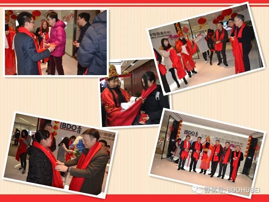 9:00—9:30   两名 “财神爷”分别为员工佩戴红围巾,并祝福员工新年快乐、财源滚滚。部门负责人给员工发福包,握手并鼓励员工在新的一年加油干、努力干、踏实干。整个活动在喜庆、欢快、热闹的气氛中结束,祝愿立信大家庭在新的一年里红红火火、福满全员!
